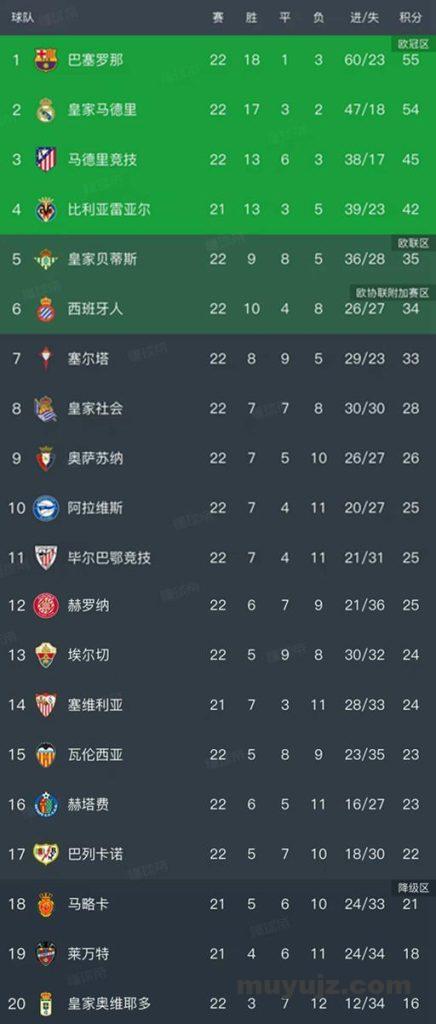 北京时间2月2日,西甲第22轮结束了9轮比赛,我们看看最新积分榜变动!