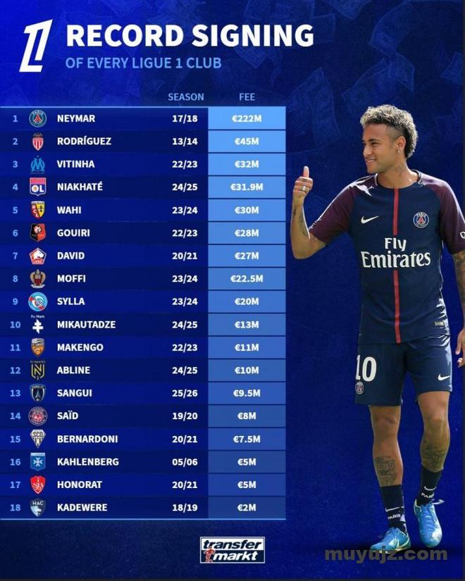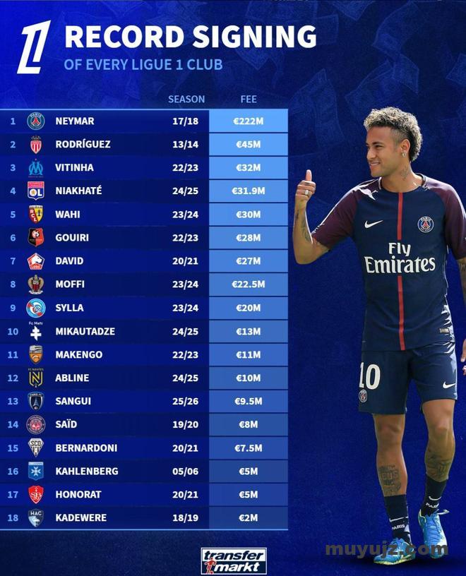 北京时间7月15日,德国转会市场网站列出了法甲18支球队队史引援转会费标王,其中内马尔2.2亿欧大幅度领先,J罗、乔纳森-戴维等人在列。