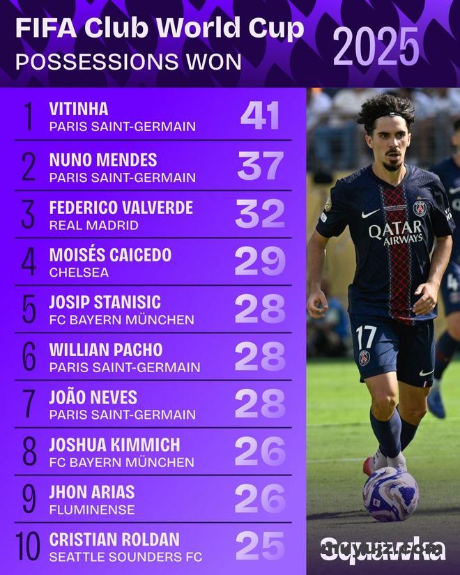 北京时间7月15日,知名数据平台Squawka列出了本届世俱杯抢回球权次数榜单。巴黎中场维蒂尼亚41次居首,努诺-门德斯37次位居次席,皇马球星巴尔韦德32次紧随其后。