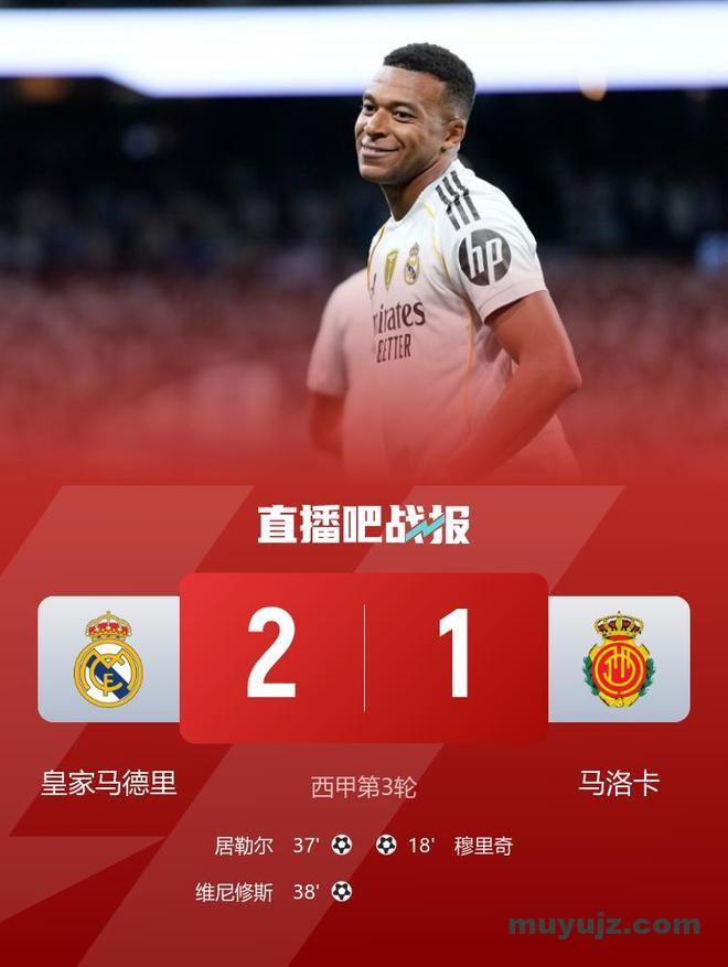直播吧8月31日讯 西甲第三轮,皇马坐镇主场伯纳乌迎战马洛卡。上半场,姆巴佩单刀破门被吹体毛越位,穆里奇头槌破门,居勒尔头槌扳平,维尼修斯光速反超,姆巴佩错失绝佳机会后再次破门被吹。易边再战,居勒尔补射建功但也还是被吹,卡雷拉斯关键门线解围。最终皇马2-1马洛卡。积分榜方面,皇马开局三连胜暂登顶,马洛卡3轮仅1分第18。