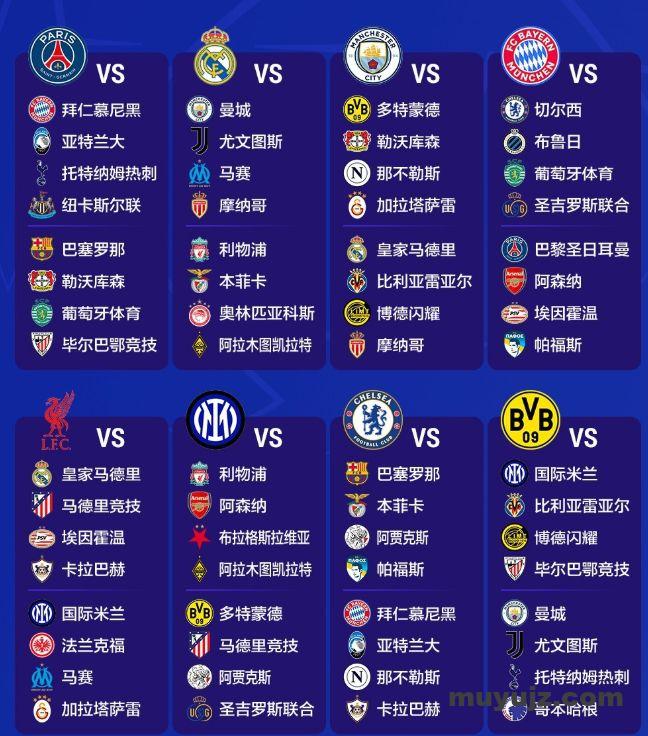 今年欧冠联赛阶段的抽签结果已经全部出炉,一共有36支球队参加,每支球队会与其他8个不同的对手进行单回合较量,其中4个主场,4个客场。而主客场也全都有抽签产生,以下是完整对阵情况。