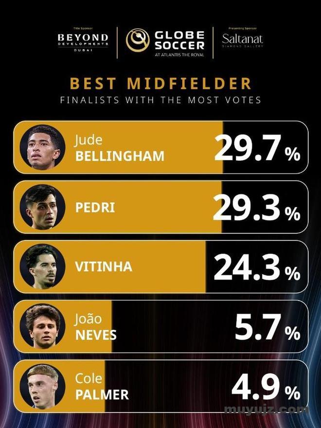 北京时间12月12日,环球足球奖(Globe Soccer Awards)公布2025年最佳中场投票结果,皇马球星贝林厄姆以29.7%的投票率位列第一,巴萨中场佩德里以29.3%的支持率紧随其后,第三名是巴黎的维蒂尼亚(24.3%)。