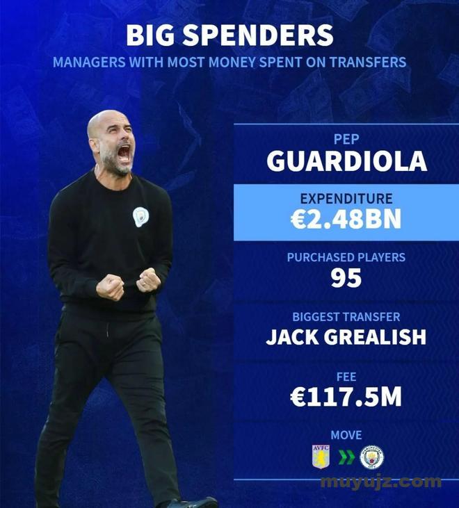 北京时间8月1日,德转统计出了世界足坛引援花费最高的5位主教练,瓜迪奥拉接近25亿欧元高居第一,穆里尼奥第二,安切洛蒂第三。