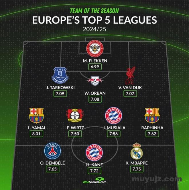 就在刚刚,数据网站Whoscored统计了2024~25赛季的五大联赛评分最佳阵容。在将球员的场均评分以及综合表现进行评估后,门将位置给到了布伦特福德球星弗莱肯。他的综合分数为6.99。客观来说,上赛季五大联赛门将当中并没有太过出彩的存在。反而是弗莱肯在这其中拿出了上佳表现,他入选这套阵容没有问题。