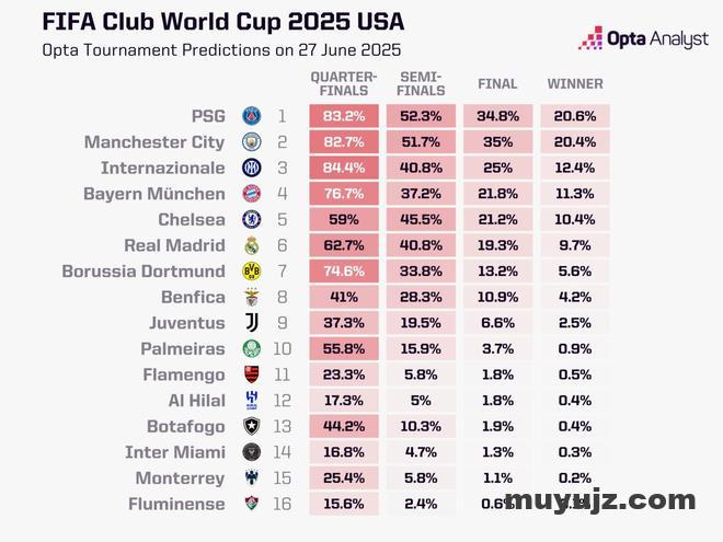 世俱杯来到淘汰赛阶段,知名数据机构Opta预测了各队晋级八强的概率。皇马晋级可能性62.7%,对手尤文图斯仅有37.3%概率进入下一轮。
