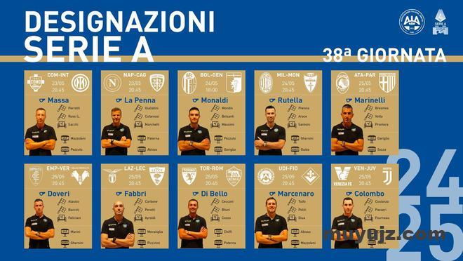 意大利裁判协会公布了意甲末轮的裁判安排,其中马萨和拉彭纳将分别执法科莫对阵国际米兰以及那不勒斯对阵卡利亚里的争冠之战。