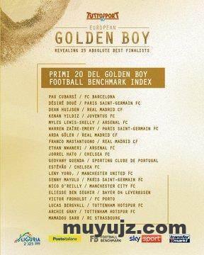 《都灵体育报》公布了2025年金童奖25人候选,杜埃、赫伊森、居莱尔、库巴西、伊尔迪兹等新星在列。