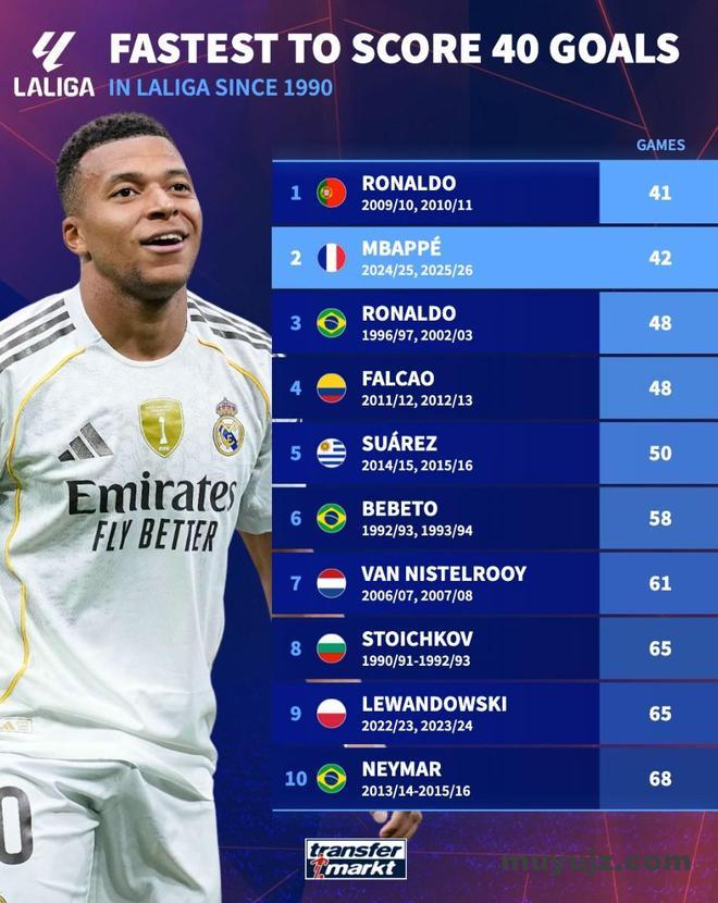 北京时间10月8日,来自德转的统计指出,姆巴佩成为了自1990年以来,在西甲联赛达成40球大关所用场次第二少的球员,仅次于C罗。