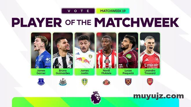 英超官方公布了联赛第19轮最佳球员候选名单,这6名球员为詹姆斯-加纳、吉马良斯、詹姆斯-贾斯廷、穆杰莱、帕奎塔、特罗萨德。