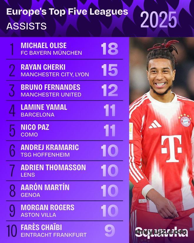 据知名数据网站Squawka统计,2025年欧洲五大联赛的助攻排行榜出炉。拜仁边锋奥利塞以18次助攻高居榜首,谢尔基以15次位列次席。
