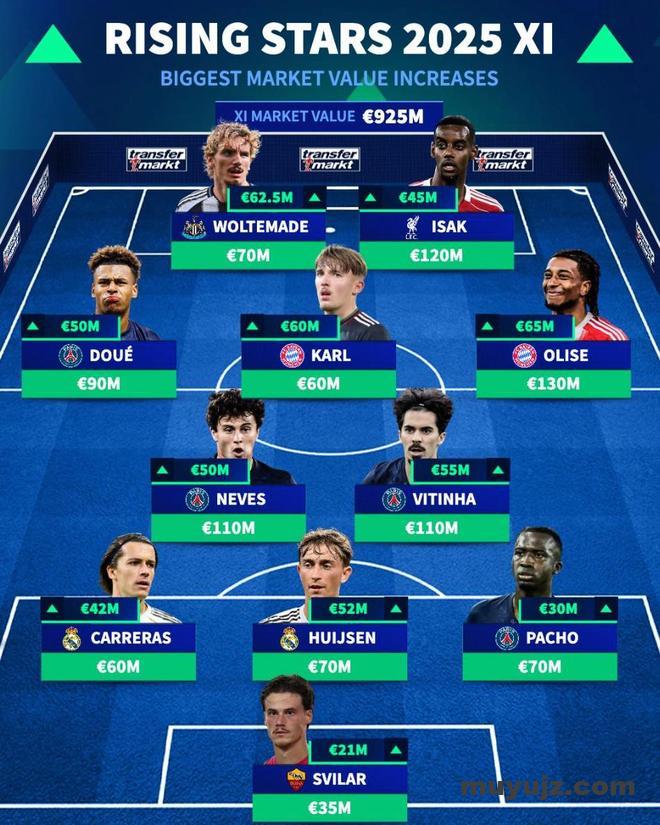 北京时间12月29日,德转列出了2025年身价涨幅最高的11人阵容,今年身价暴涨6500万欧元的奥利塞领衔,身价上涨6250万欧元的沃尔特马德和身价上涨6000万欧元的伦纳特-凯尔在列。