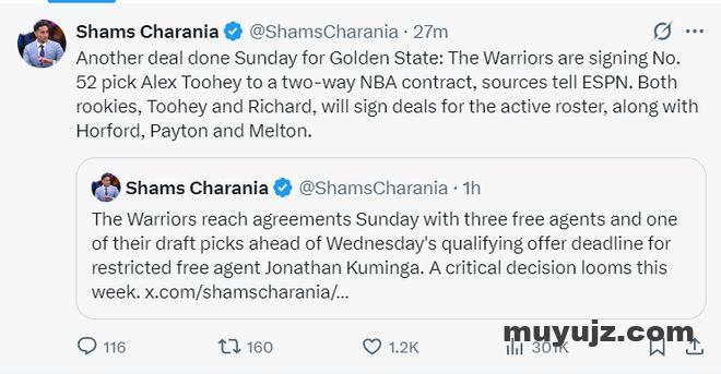 北京时间9月29日,勇士确定将连签5人,包括霍福德、库明加、小佩顿以及新秀威尔-理查德和图希。这些签约预计都将在库明加的受限制自由球员问题解决后正式官宣。随后,薪金专家Marks给出了勇士签约后的解析。