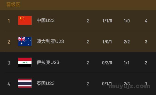 2.澳大利亚和伊拉克打平,同为4分的中、澳、泰将不得不比较相互比赛间净胜球,3队争2个出线名额;若U23国足输泰国队2球及以上,将被淘汰。