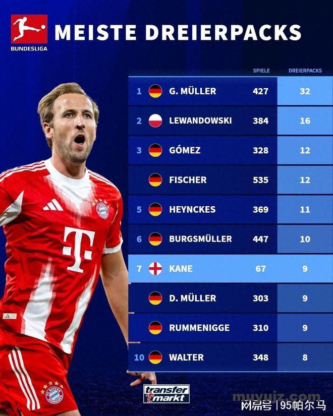 对标姆巴佩,参照梅西,32岁的凯恩并没有辜负“大英帝星”的头衔,以至于两届德甲金靴的履历并不能完全匹配星光,或者说他在德甲真正意义上实现了降维打击。比如他只用了67场比赛就完成了9次帽子戏法,他只用了104场就完成拜仁百球里程碑,并成为21世纪最快为五大联赛俱乐部打进百球的球员。