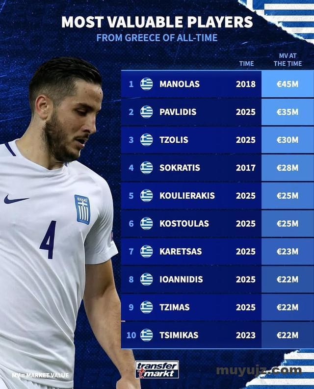 北京时间11月16日,德转列出了希腊历史身价排名前10的球员,2018年身价曾经达到4500万欧元的马诺拉斯高居第一,本菲卡前锋帕夫利季斯3500万欧元第二,利物浦的旧将齐米卡斯排在第十位4,布莱顿的两位新星18岁的科斯图拉斯和19岁的齐马斯上榜。