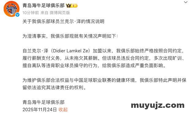 北京时间11月24日晚,中超青岛海牛俱乐部官方发文,回应了关于外援兰克尔-泽的欠薪指控。