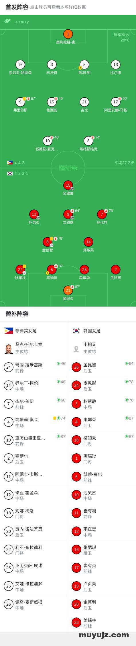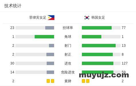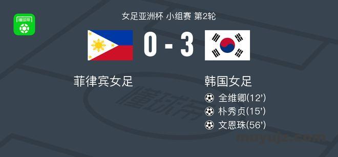 北京时间3月5日女足亚洲杯 小组赛 第2轮,菲律宾女足对阵韩国女足。韩国女足全维卿破门,朴秀贞破门,文恩珠破门。最终比分菲律宾女足 0–3 韩国女足。