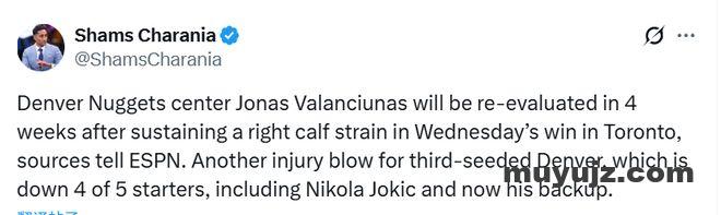 北京时间1月2日,名记Shams报道,据ESPN消息人士透露,丹佛掘金队中锋瓦兰丘纳斯在周四客场对阵猛龙队的比赛中右小腿拉伤,将在4周后接受复查。这对排名第三的掘金队来说无疑是又一次伤病打击,目前球队五名首发球员中已有四人缺阵,约基奇和他的替补瓦兰丘纳斯都受伤了。