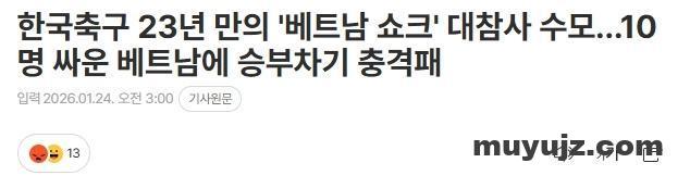 因为本场失利是韩国自2003年亚洲杯预选赛成年队0-1爆冷不敌越南后,时隔23年再次输给越南。韩媒直言,这支韩国U23男足令人陌生,完全不像曾经“斗志顽强”的太极虎。