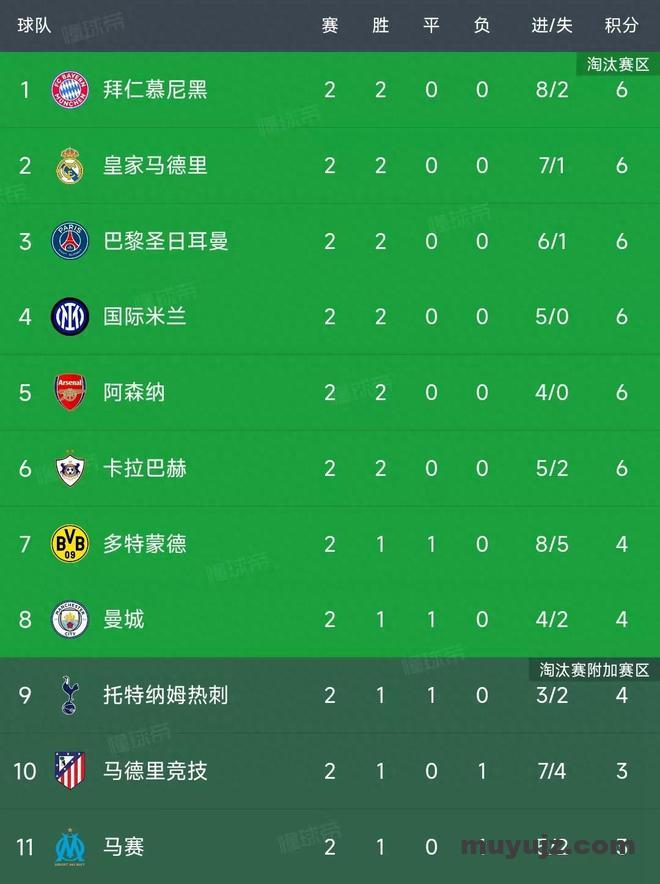 英超球队只有阿森纳收获两连胜,本轮2-0战胜了奥林匹亚科斯,马丁内利和萨卡破门,这2场比赛,枪手和国米一样都是0失球。曼城在客场2-2和摩纳哥战平,哈兰德梅开二度,冈萨雷斯在最后时刻犯规送点,戴尔点射绝平,曼城1胜1平积4分暂列第8名。