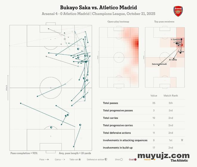 他与廷贝尔的换位配合非常犀利,让这位右后卫能够轻松参与进攻。他在防守端也同样积极。上半场中段,他已经完成了一次铲抢和两次拦截,帮助阿森纳阻止马竞组织进攻。