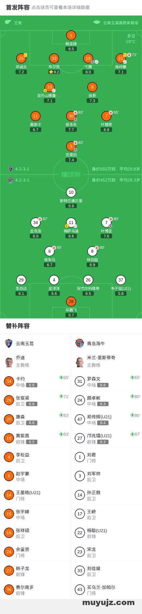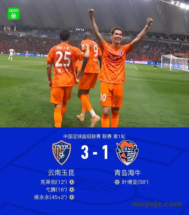 北京时间3月7日中国足球超级联赛 联赛 第1轮,云南玉昆主场对阵青岛海牛。云南玉昆克莱伯破门,弋腾破门,侯永永破门。青岛海牛叶博亚破门。最终比分云南玉昆 3–1 青岛海牛。